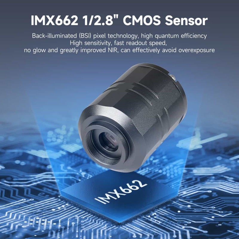 ensor CMOS IMX662 de 1/2,8" : tecnología de píxeles retroiluminados (BSI), alta eficiencia cuántica, alta sensibilidad, velocidad de lectura rápida, sin brillo y NIR muy mejorado, puede evitar eficazmente la sobreexposición, bajo ruido (0,7e-), ideal para imágenes planetarias con poca luz;
