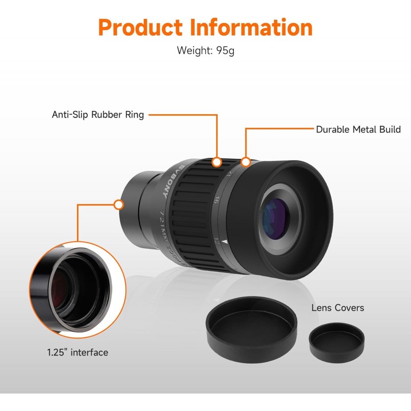 - Alivio ocular de 13 mm a 14 mm ; con ocular de goma; proporciona una visión cómoda a largo plazo para personas con o sin gafas;