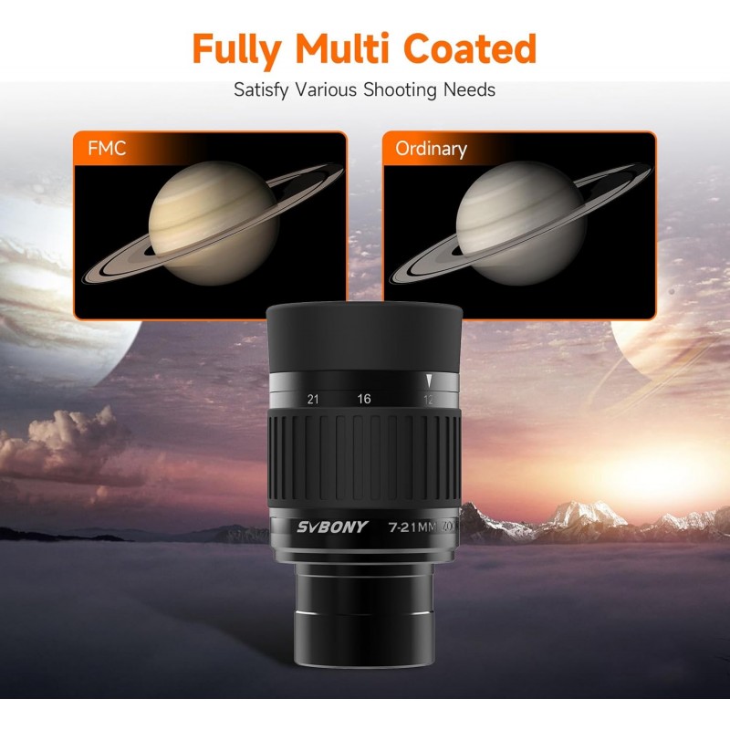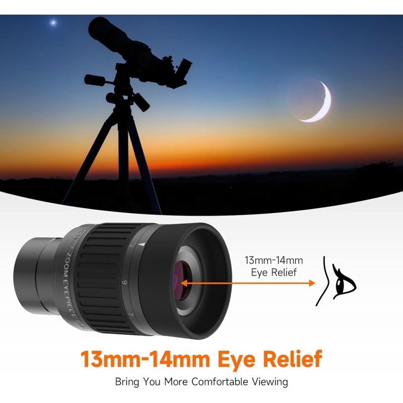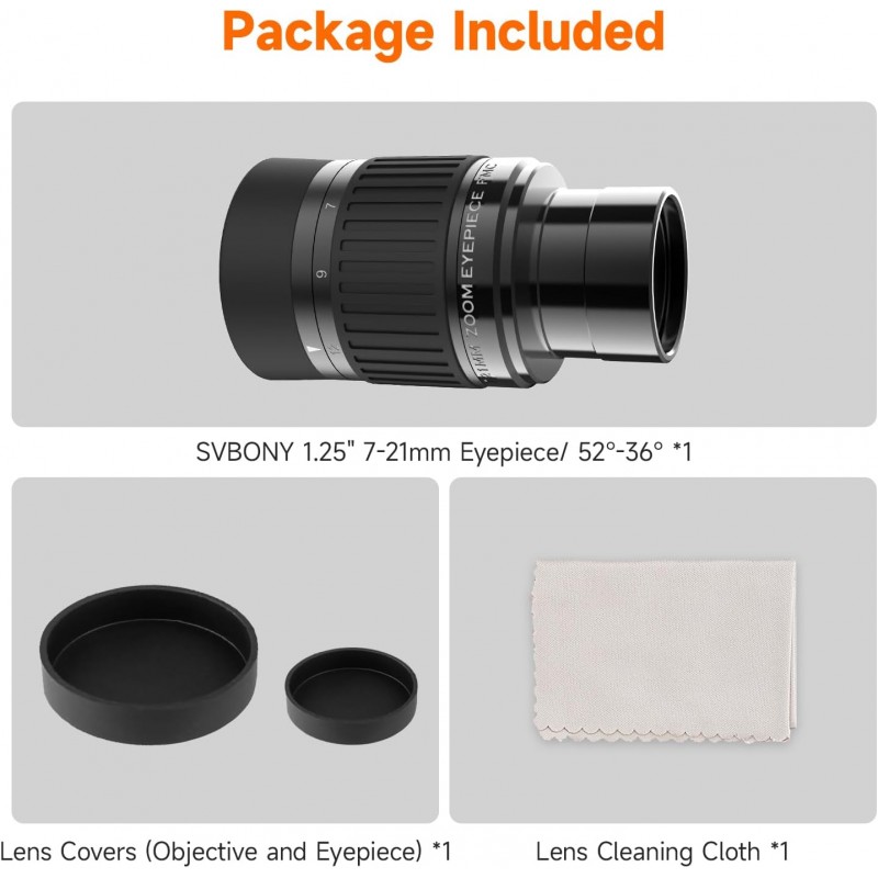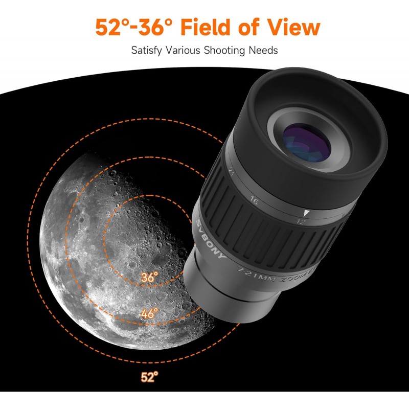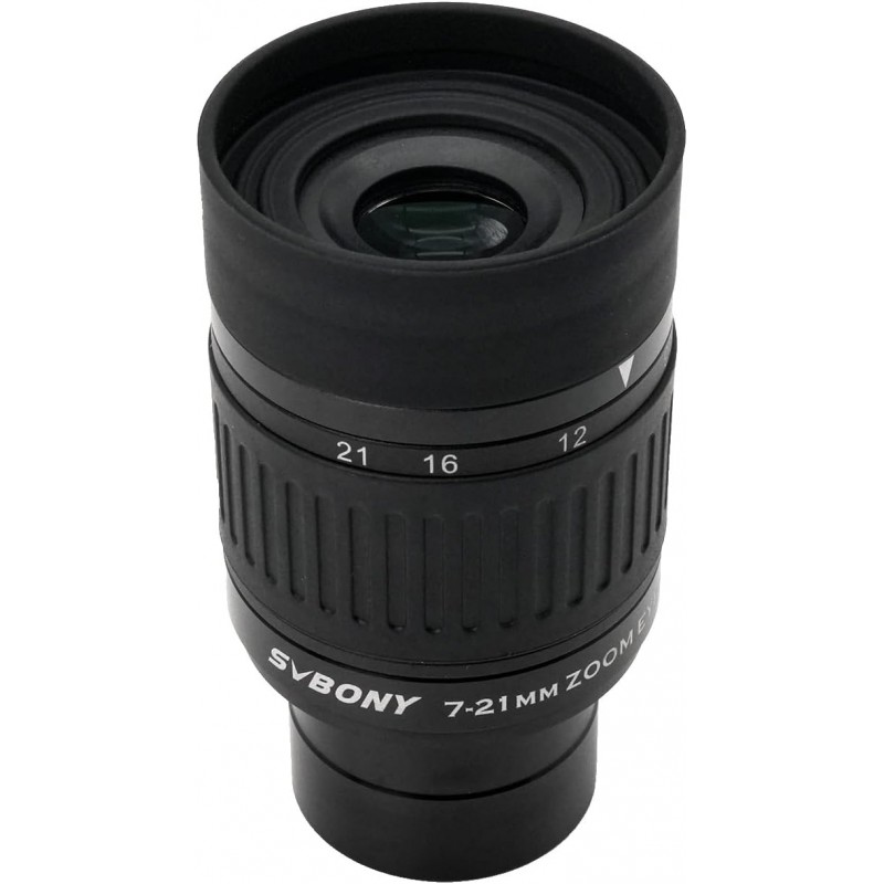 - Ocular con zoom de 7-21 mm ; permite cambiar el poder de aumento sin cambiar los oculares; adecuado para ver la superficie lunar; planetas; nebulosas; cúmulos de estrellas;