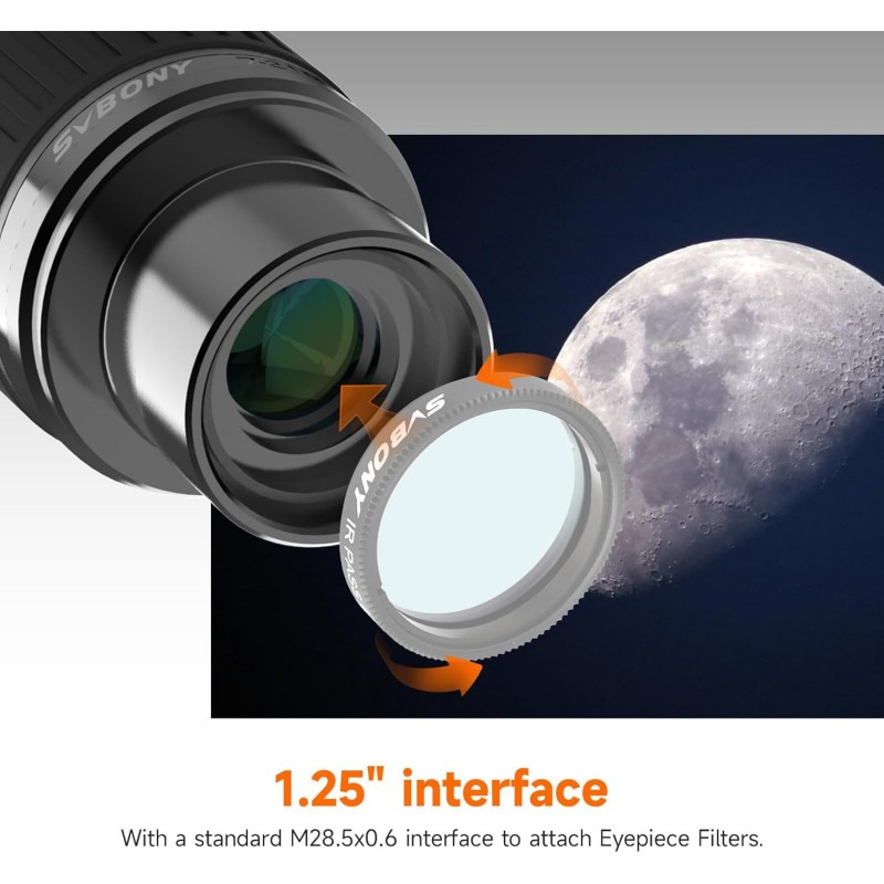 - Interfaz estándar de 1,25 pulgadas ; compatible con telescopios de 1,25 pulgadas y accesorios de filtro; diseño de ranura anticaída; evita eficazmente caídas accidentales durante el uso.