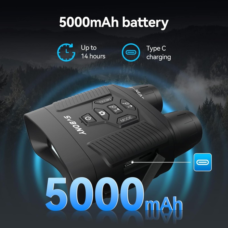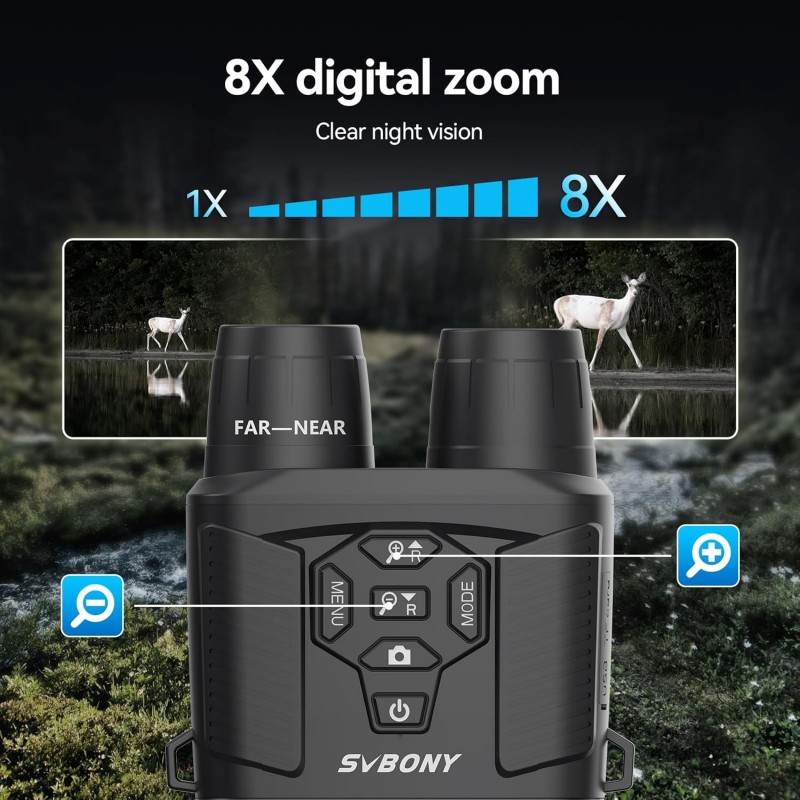 Los SVBONY SA206 son binoculares digitales de visión nocturna diseñados para observar en oscuridad total y grabar evidencias en foto y video. Incorporan iluminador infrarrojo (IR) 850 nm con niveles ajustables, zoom digital 8X, pantalla HD integrada y batería recargable de alta capacidad. Ideales para camping, vigilancia, patrullaje y observación de fauna.