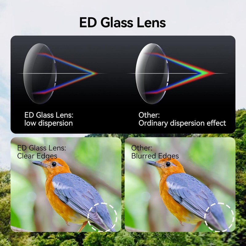 - Lentes ED (Extra-Low Dispersion): imagen más nítida y con mejor control de franjas de color