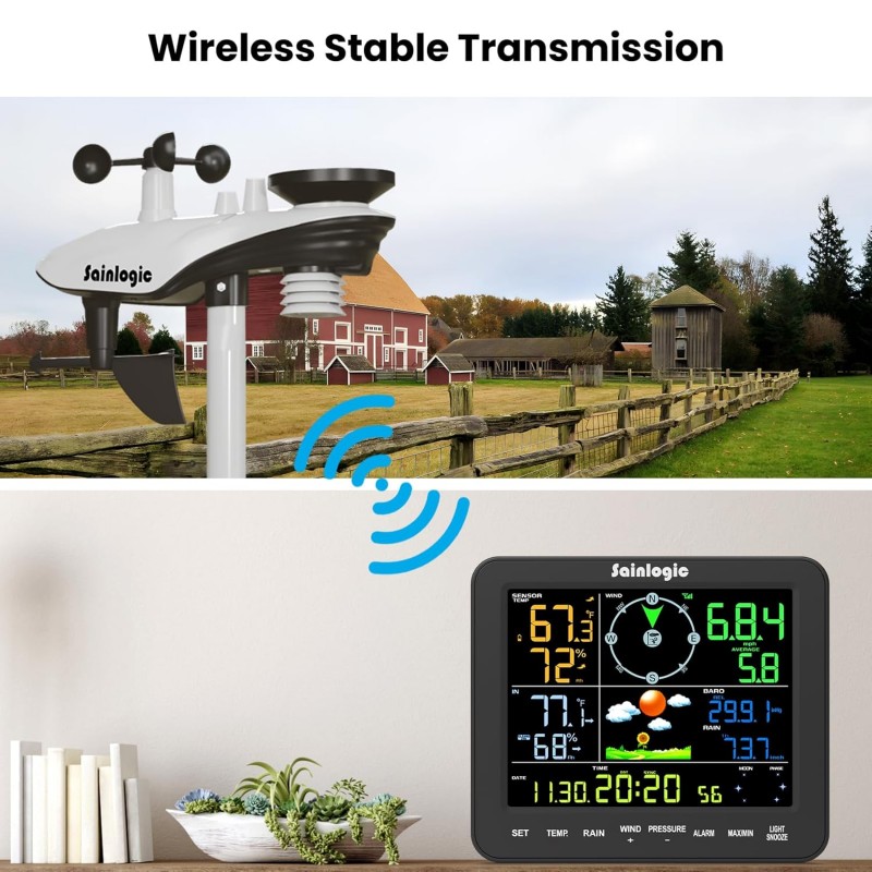 La Sainlogic SA8 es una estación meteorológica inalámbrica para interiores y exteriores con sensor exterior todo-en-uno y consola interior. Permite monitorear variables clave del clima en tiempo real con lectura clara y retroiluminación ajustable, ideal para hogar, finca, jardín, cultivos, bodegas o actividades al aire libre.