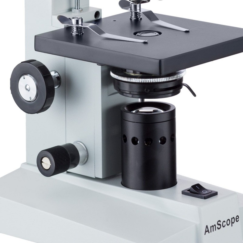 La platina cuenta con dos clips para sujetar portaobjetos y otras muestras. El microscopio utiliza perillas de enfoque independientes para controlar los ajustes gruesos y finos. Un mecanismo de tope ajustable impide que las lentes entren en contacto con las muestras, lo que previene daños en las lentes y los portaobjetos.