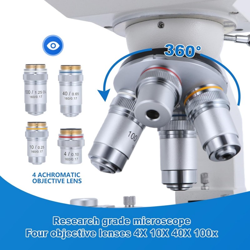 - Objetivos acromáticos incluidos: 4X, 10X, 40X y 100X.