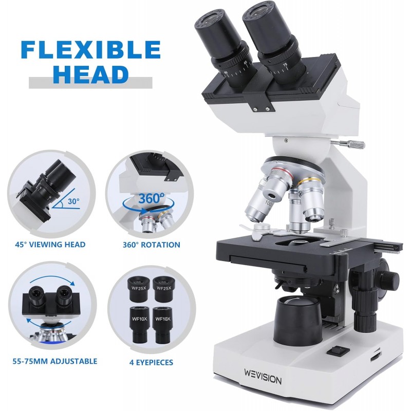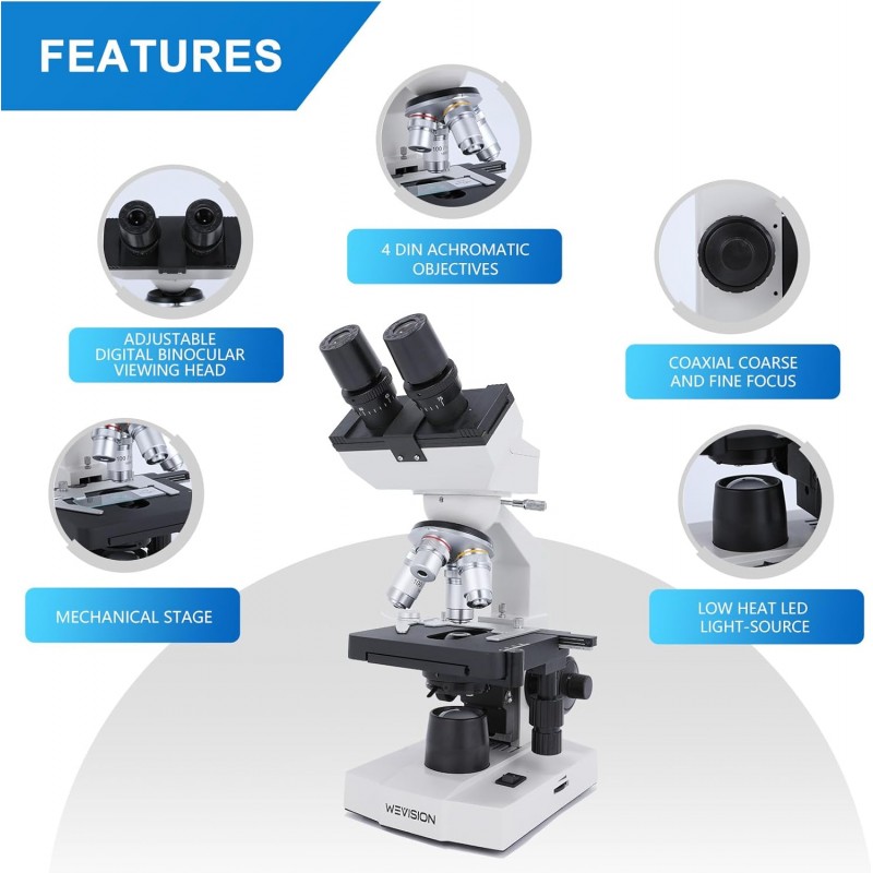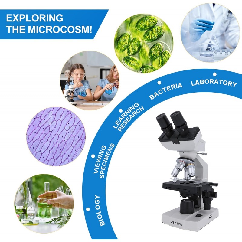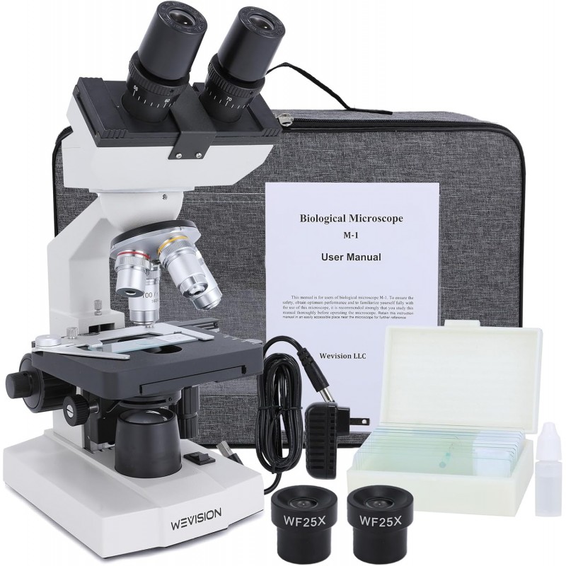 Microscopio Binocular Compuesto de Laboratorio WeVision M1 40X–2500X – Objetivos Acromáticos 4X/10X/40X/100X, Platina Mecánica X-Y, Condensador Abbe, Enfoque Coaxial, Iluminación LED, Kit Completo
