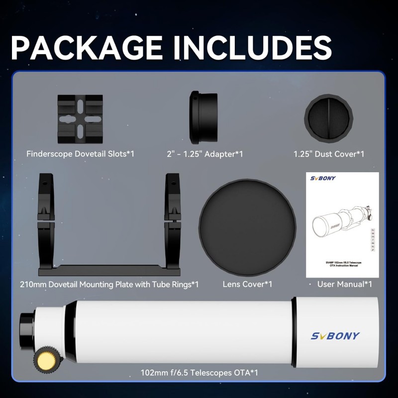 Los telescopios refractores SV48P para astronomía cuentan con una gran apertura de 102 mm. Al observar planetas o galaxias, es útil mejorar el brillo y la eficiencia de la observación. Además, su gran lente objetivo está diseñado para ofrecer alta resolución, buena capacidad de captación de luz y una relación focal de f/6.5, lo que permite obtener imágenes más brillantes.