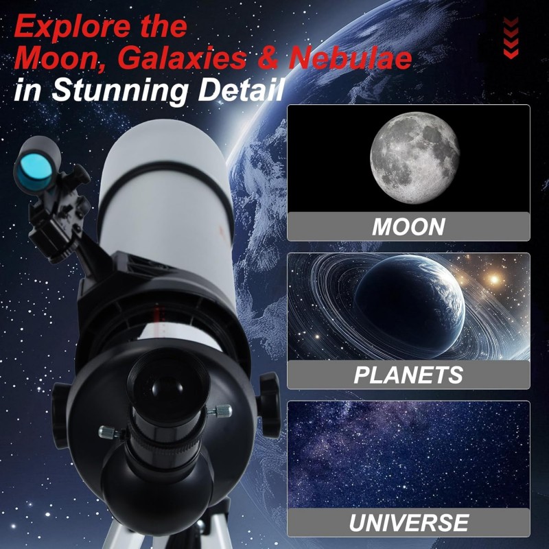 ✨ El telescopio refractor 80 mm / 600 mm ofrece una experiencia completa para disfrutar del cielo nocturno con excelente calidad óptica y accesorios que garantizan comodidad, precisión y facilidad de uso.