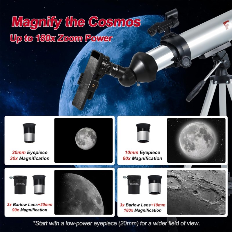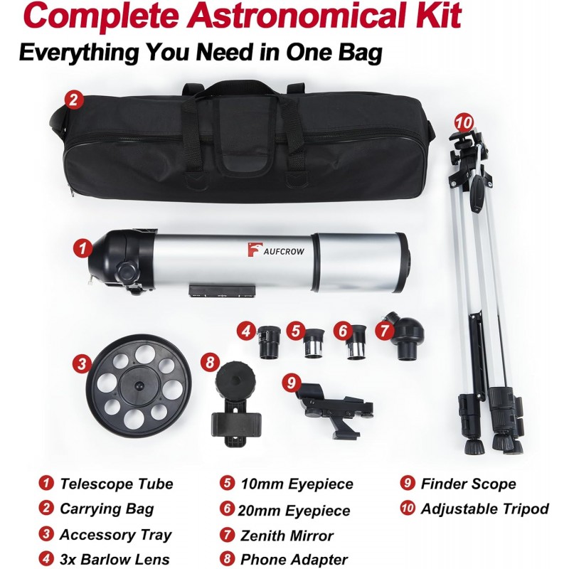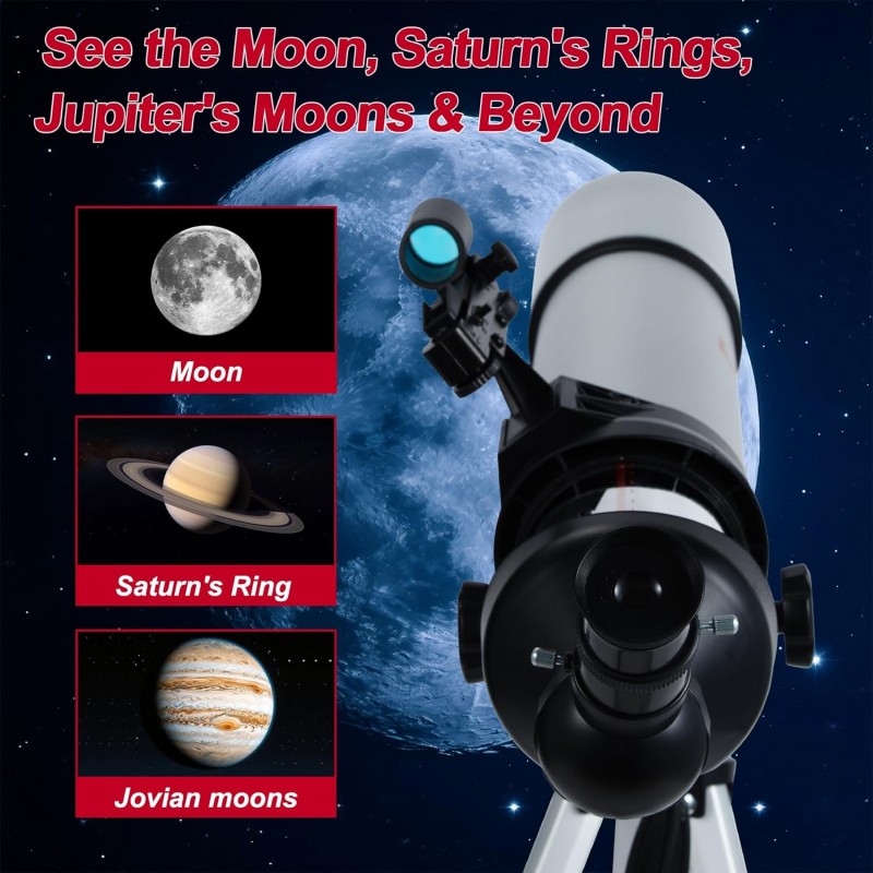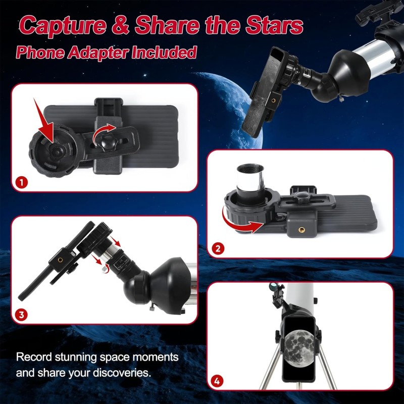 ✨ El telescopio refractor 80 mm / 600 mm ofrece una experiencia completa para disfrutar del cielo nocturno con excelente calidad óptica y accesorios que garantizan comodidad, precisión y facilidad de uso.