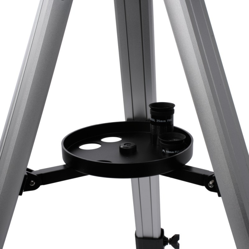 Este refractor de 90 mm incluye una montura ecuatorial alemana que permite un seguimiento fluido y preciso del cielo nocturno. Se apoya sobre un trípode de aluminio resistente y ligero, equipado con un accesorio de encaje a presión y una bandeja para oculares. El anillo y el soporte del tubo incluidos se fijan a un robusto sistema de montaje de cola de milano estilo Vixen, lo que facilita el bloqueo rápido del telescopio. También incluye un contrapeso de 1.8 kg y un eje de 20 cm, que funcionan junto con las dos perillas de control de movimiento lento para ofrecer una experiencia de observación precisa y fluida.