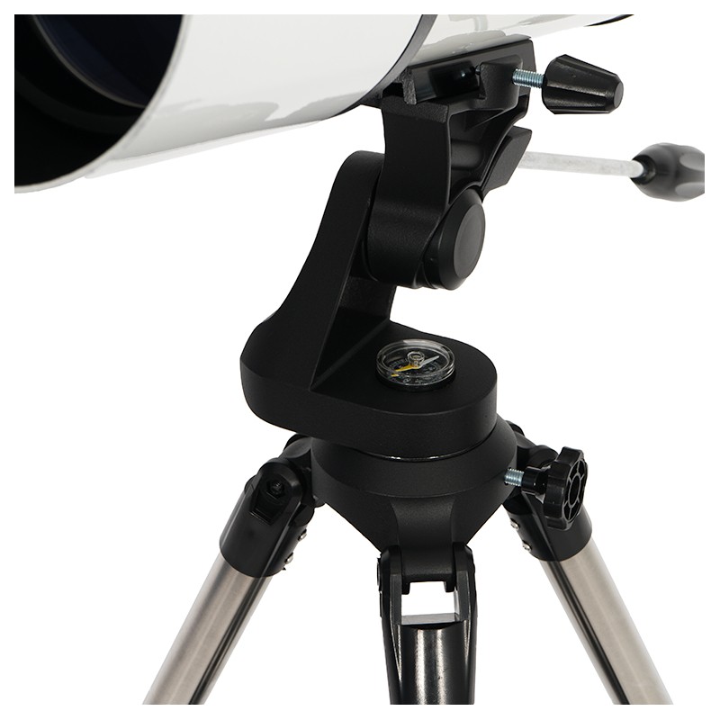 El robusto trípode extensible está hecho de acero inoxidable y cuenta con un soporte central para mayor rigidez. Una práctica bandeja para accesorios se fija al soporte central mediante un sencillo mecanismo de giro. El cabezal panorámico de dos ejes proporciona un control fácil y fluido del telescopio mediante el asa panorámica. La altura máxima del ocular es de 130 cm con las patas del trípode completamente extendidas. También incluye una diagonal de 90 grados que proporciona una visión correctamente orientada (imprescindible para la observación terrestre), un ocular Plossl de 25 mm (24x) y 10 mm (60x), un nivel de burbuja y brújula de doble propósito, y un buscador de punto rojo de fácil instalación, que facilita la localización de objetivos de interés.