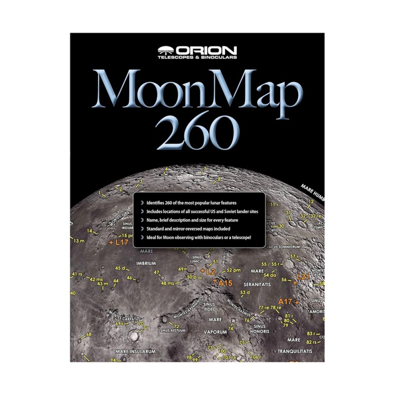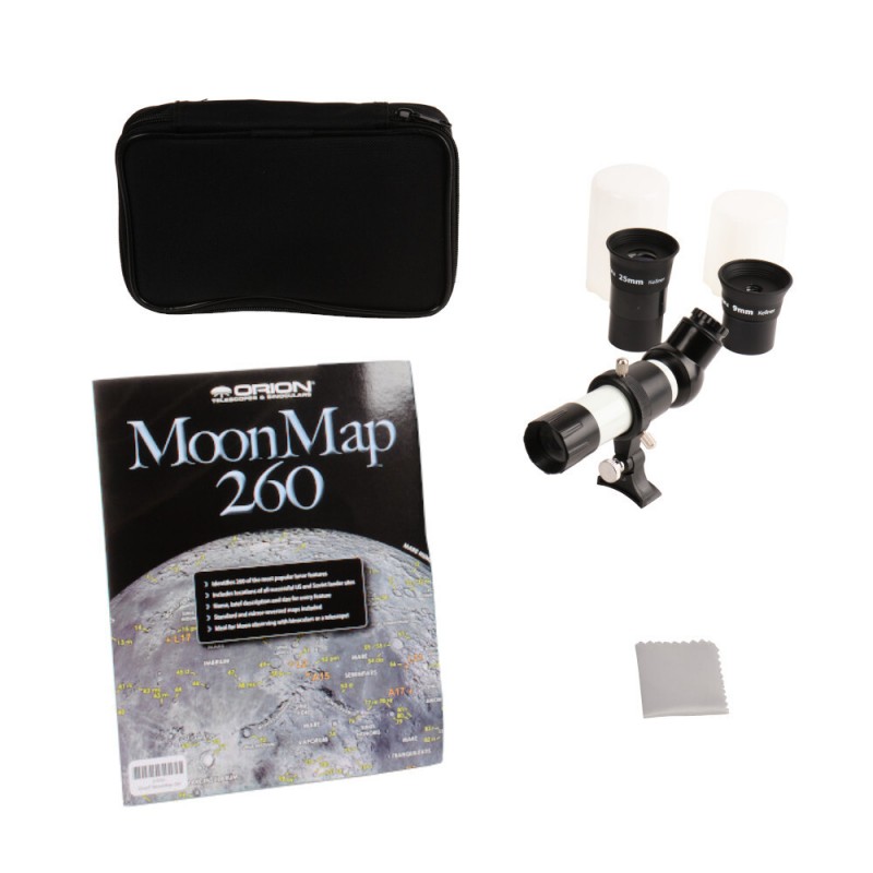 Este kit de telescopio de viaje incluye una copia gratuita del Mapa Lunar 260 de Orión, un mapa detallado y resistente al agua de nuestro único satélite natural. Al observar la Luna a través del Refractor de Viaje Starblast de 90 mm y el ocular de 9 mm incluido, la superficie lunar se verá nítida y vívida, lo que facilita la exploración de los restos de antiguos flujos de lava o la inmersión en los impresionantes cráteres que adornan la superficie de nuestro compañero cósmico más cercano. Con el Mapa Lunar 260 a tu lado, tendrás todo lo necesario para descubrir los numerosos tesoros ocultos que nuestra Luna tiene para ofrecer.
