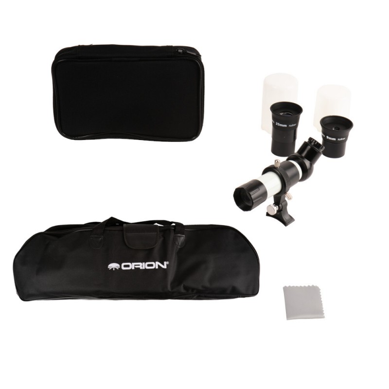 Este kit de viaje Orion StarBlast AZ incluye un refractor acromático de acero inoxidable de 90 mm con una distancia focal de 500 mm. Con una rápida relación focal de f/5.6, este refractor, ideal para principiantes, proporcionará vistas brillantes de innumerables paisajes celestes. La diagonal de imagen correcta de 90° incluida facilita la visualización de objetivos terrestres. Incluye oculares Kellner de 9 mm y 25 mm, que proporcionan una nitidez excepcional en el punto central que sin duda destacará al observar cúmulos estelares brillantes. Al observar con el ocular de 10 mm, objetos grandes como la Luna prácticamente llenarán la vista, lo que facilita perderse en la serenidad de los paisajes lunares.