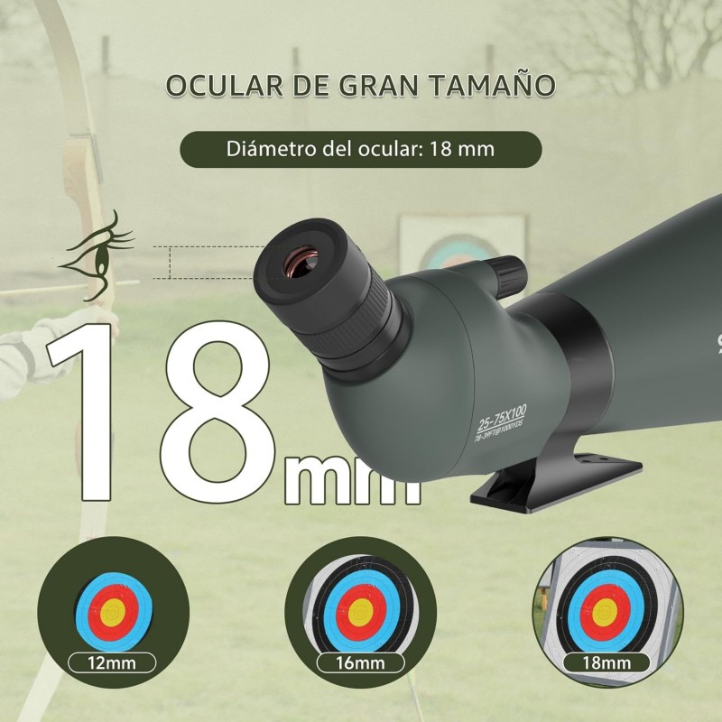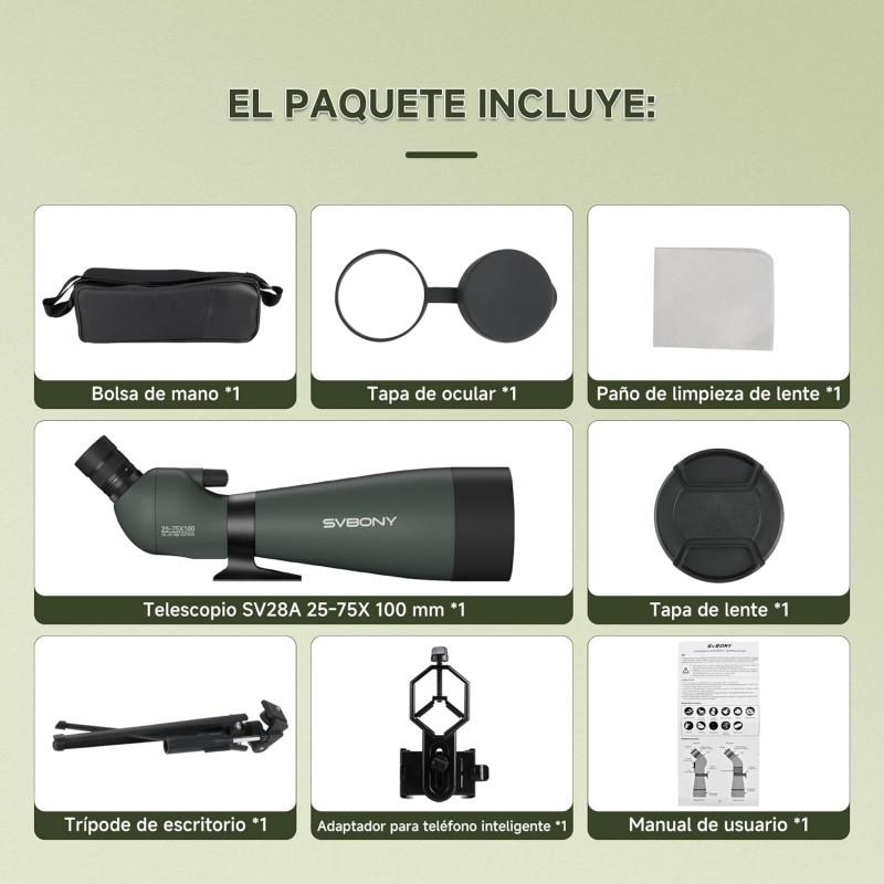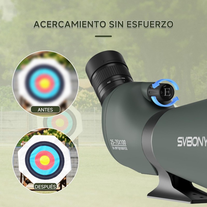 El SVBONY SV28 25–75x100 es un telescopio terrestre (spotting scope) con ocular en ángulo, diseñado para observación a larga distancia en actividades como avistamiento de aves, naturaleza, paisaje y tiro al blanco. Su objetivo de 100 mm capta más luz para una imagen más brillante y con mejor detalle, especialmente en condiciones de poca iluminación. El ocular en ángulo permite una postura más cómoda durante observaciones prolongadas.